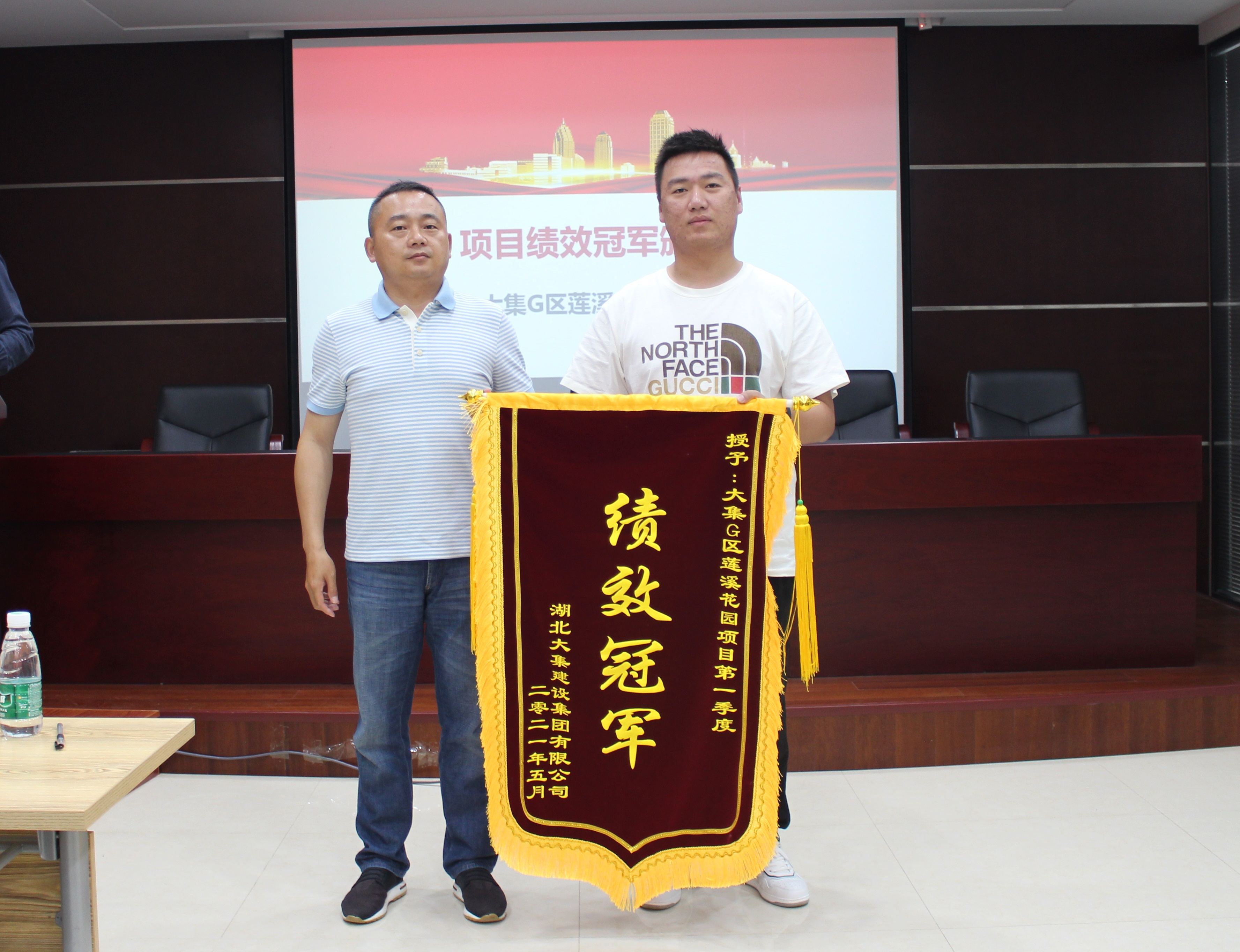 隨后,行政部部長李漢毛公布項目第一季度績效考核排名,并由集團(tuán)公司董事長徐濤為第一季度項目績效冠軍——大集G區(qū)蓮溪花園項目頒發(fā)錦旗及獎金。