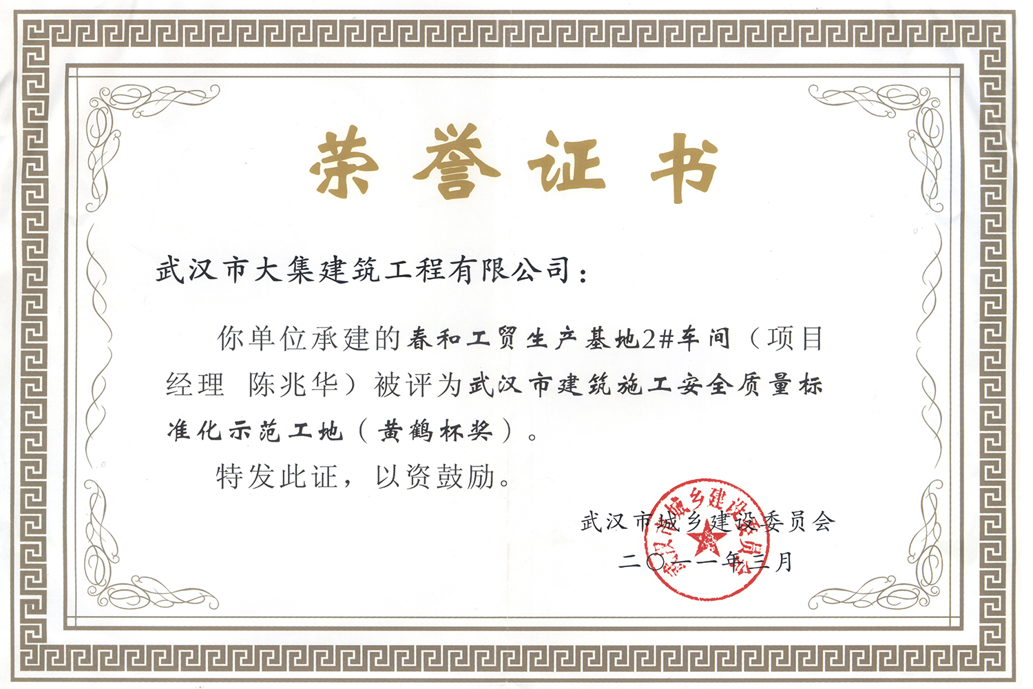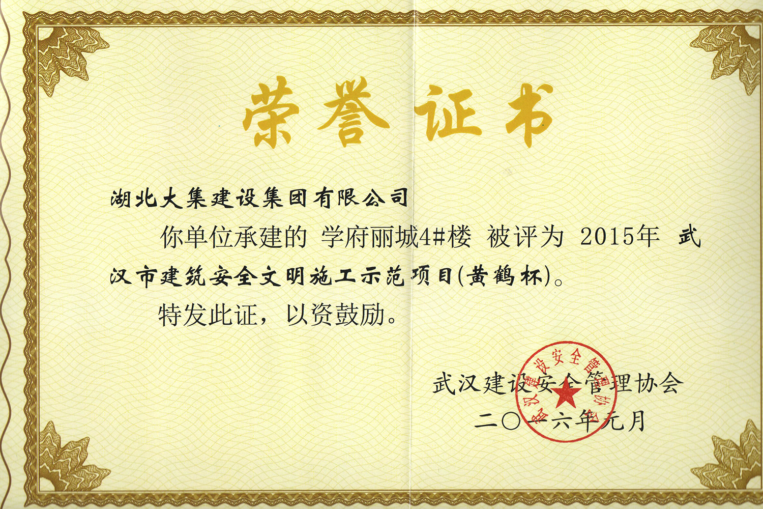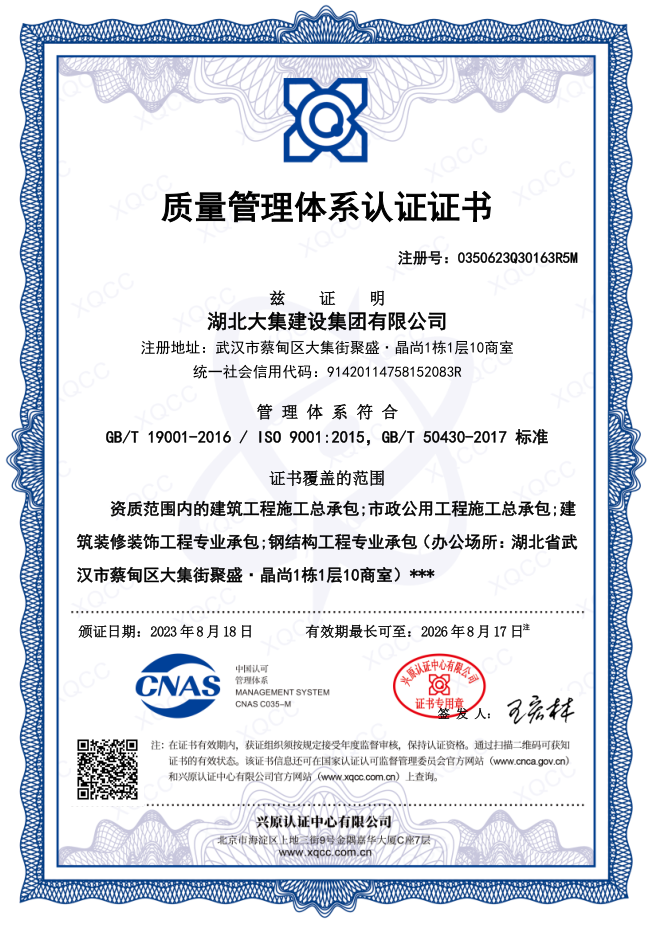 集團秉持“安全是紅線,質(zhì)量是品牌,文明施工是形象”的企業(yè)宗旨,不斷加強全面管理,注重提高自身素質(zhì),以完美的履約、優(yōu)良的質(zhì)量、滿意的服務(wù),贏得了信譽。近年來,湖北大集建設(shè)集團先后與中石化集團、中鐵上海工程局、中建八局、中鐵十二局、碧桂園集團、世茂集團、綠地集團等央企、國企、地方標志性建設(shè)單位合作,先后承建了“碧桂園知音豪庭”項目、“碧桂園光谷云境”項目、“大集G區(qū)蓮溪花園”項目等多個高層住宅小區(qū);承建了世茂龍灣46#、47#、48#地塊、花博匯桃李春風(fēng)二期等多個精品高端別墅群項目;承建了“南湖中學(xué)”、“南湖小學(xué)”、“南湖幼兒園”、“博奧幼兒園”等多個教育配套項目;承建了“孝感英眾超算終端科技產(chǎn)業(yè)園”、“鴻盛華全球航空服務(wù)產(chǎn)業(yè)園”、“盟盛汽車產(chǎn)業(yè)園”、“中原印務(wù)晶毅”等多個具有特殊設(shè)備安裝需求的鋼、混結(jié)構(gòu)工業(yè)廠房項目;承建了“常福商務(wù)廣場”等大型商業(yè)綜合體;承建了后官湖綠道二期、三期,常貴路西延伸段、黃星大道等多條大型道路市政項目;自主開發(fā)了“聚盛晶尚”住宅項目,改善人居環(huán)境,引領(lǐng)綠色棲居新領(lǐng)域;所有工程嚴格執(zhí)行施工作業(yè)全過程質(zhì)量、安全管理,多個項目被省、市級監(jiān)管單位授予“省結(jié)構(gòu)優(yōu)質(zhì)”、“省安全文明施工現(xiàn)場”、“市結(jié)構(gòu)優(yōu)質(zhì)”、“市安全文明施工示范項目”、“樣板工地”等榮譽稱號。