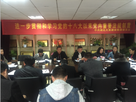 為了深入貫徹落實(shí)黨的十八屆六中全會(huì)精神,增加思想政治教育,加強(qiáng)黨的知識(shí)普及,2016年11月21日下午,湖北大集建設(shè)集團(tuán)黨委組織全體黨員同志在集團(tuán)會(huì)議室集中學(xué)習(xí)《中國(guó)共產(chǎn)黨章程》、《中國(guó)共產(chǎn)黨廉潔自律準(zhǔn)則》、《關(guān)于新形勢(shì)下黨內(nèi)政治生活的若干準(zhǔn)則》、《中國(guó)共產(chǎn)黨紀(jì)律處分條例》等黨內(nèi)文件和重要法規(guī)制度。