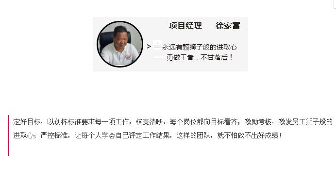 在7月份集團各施工項目的績效考核評結(jié)果中,南湖小學項目以90分的高分榮獲第一名的好成績!項目績效考評嚴格復(fù)雜,涉及質(zhì)量、安全、資料、管理等方方面面,能取得這樣的成績實屬不易,問起項目經(jīng)理徐家富項目取得高分的秘籍,他笑著說,讓每個人都有一顆獅子般的進取心,勇做王者,不甘落后,一切都能迎刃而解!近期,我們深入項目學習才發(fā)現(xiàn),成功絕對不是偶然,不僅項目經(jīng)理擁有一顆獅子般的雄心,項目中的每一個人都有一顆拼搏進取,不甘落后的心,使得他們對每一個細節(jié)的管理都嚴格按照標準,精益求精,方才成就今日的累累碩果!