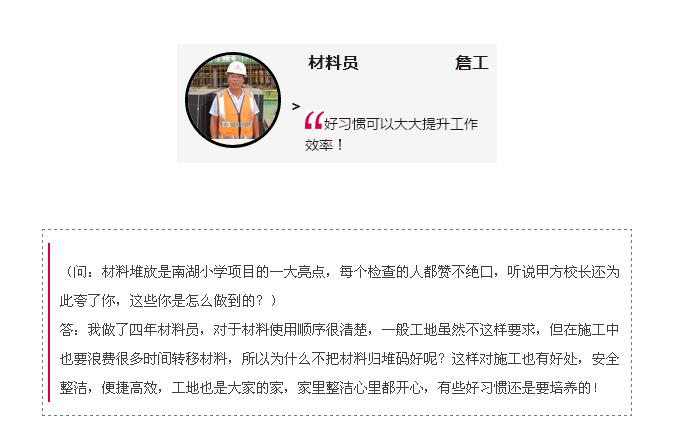 南湖小學項目是事關(guān)教育百年大計的重要民生工程,開工以來不僅受到各級政府領(lǐng)導(dǎo)的熱切關(guān)注,也受到集團領(lǐng)導(dǎo)的高度重視,自承接項目伊始,項目經(jīng)理徐家富就承諾:一定要把南湖小學項目做成集團的樣本工程,創(chuàng)杯工程,讓社會和政府滿意的工程!短短三個月的時間,南湖小學項目就取得了不少成就,不僅受到政府各級領(lǐng)導(dǎo)的表揚,也榮獲了集團各職能部門的一致好評,更讓他的承諾成功轉(zhuǎn)化為現(xiàn)實!