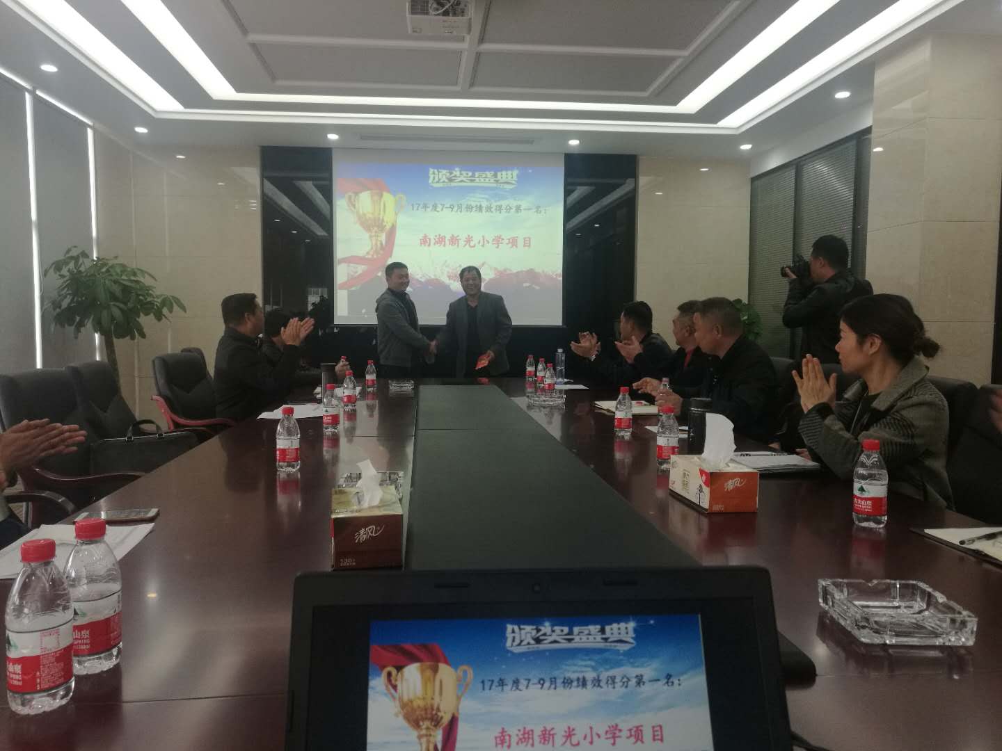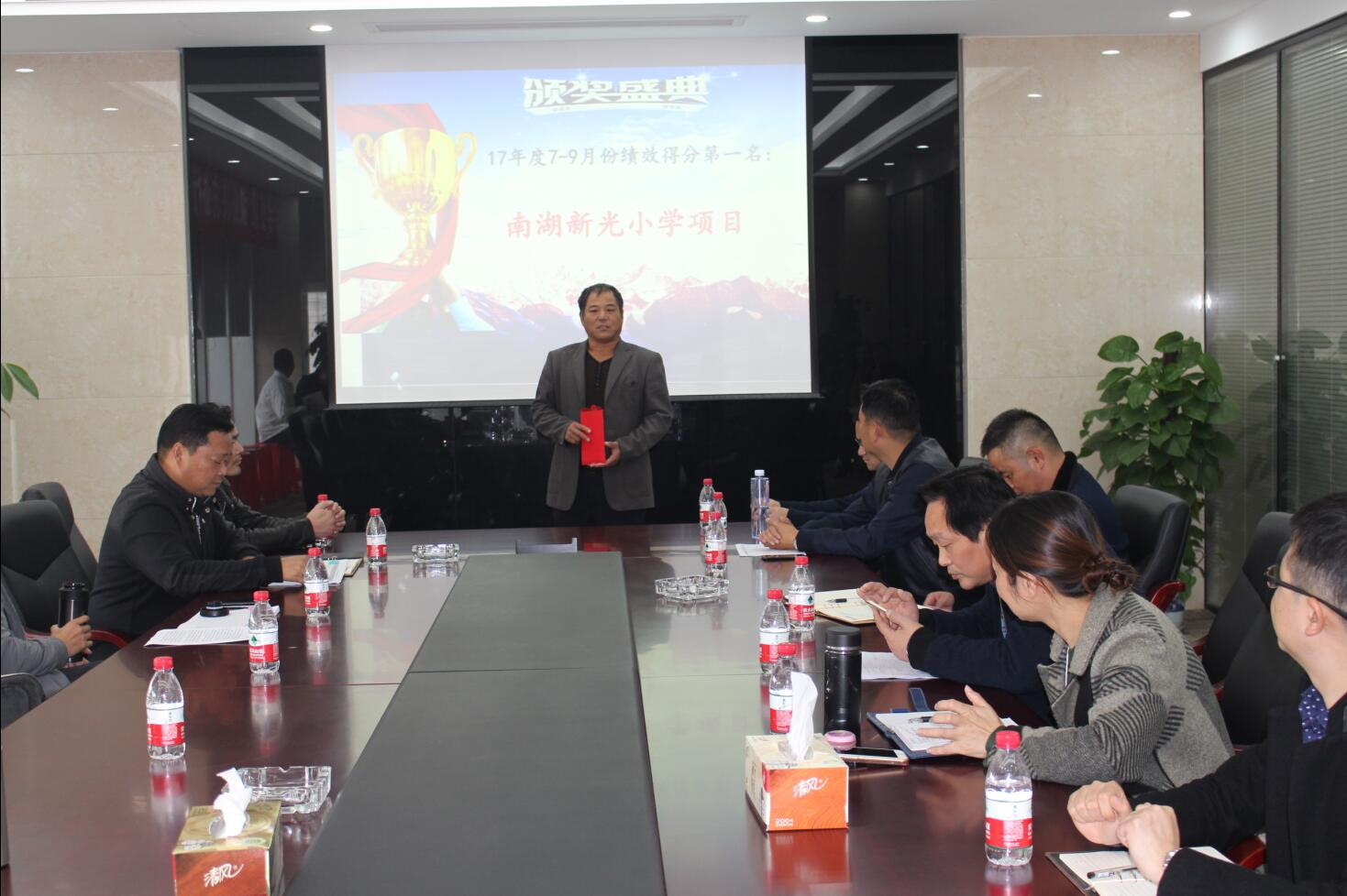 會(huì)議開始,由人事行政部公布了上季度績(jī)效考評(píng)中的冠軍項(xiàng)目——南湖(新光)小學(xué)項(xiàng)目,并由董事長(zhǎng)徐濤向冠軍項(xiàng)目頒發(fā)10000元獎(jiǎng)金!
