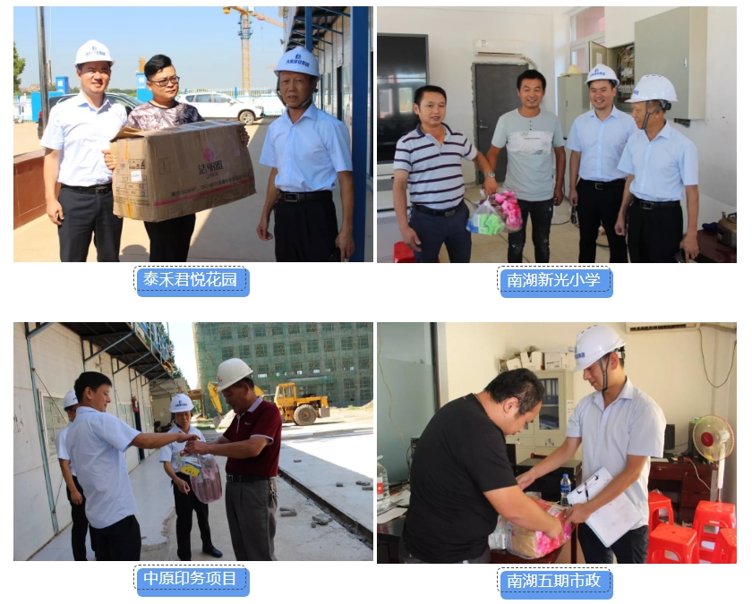 為切實(shí)做好夏季施工現(xiàn)場(chǎng)防暑降溫工作,7月19日,集團(tuán)公司開(kāi)展一線(xiàn)慰問(wèn)送清涼活動(dòng),前往各項(xiàng)目部發(fā)放毛巾、風(fēng)油精、人丹、十滴水等防暑降溫物資,同時(shí)要求各項(xiàng)目負(fù)責(zé)人要從以人為本、安全生產(chǎn)的高度,做好高溫防暑措施,合理安排好夏季高溫作業(yè)時(shí)間,確保項(xiàng)目一線(xiàn)員工安度酷暑。