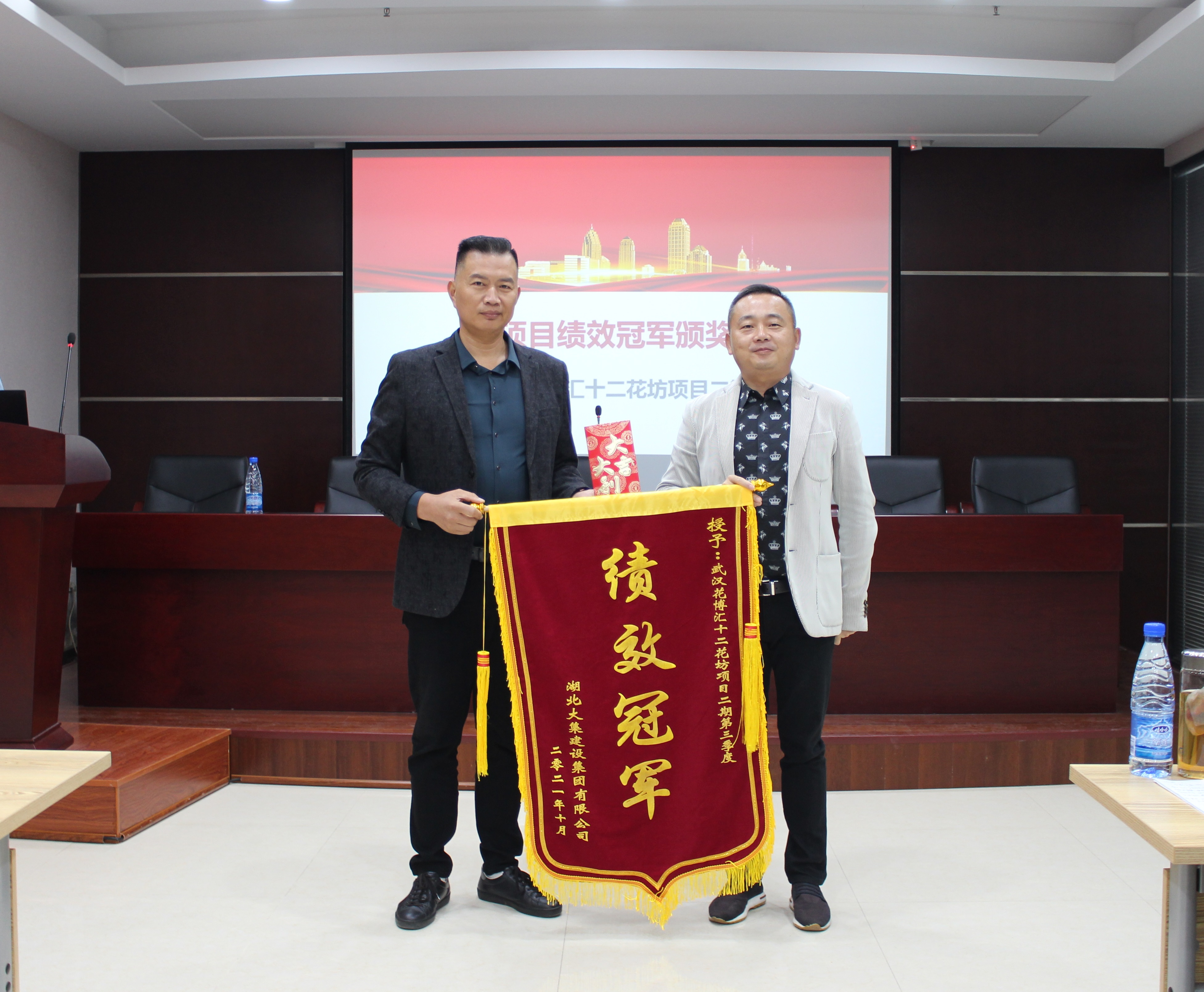 會(huì)議開始,行政部公布集團(tuán)公司2021年第三季度項(xiàng)目績(jī)效考核結(jié)果,并由集團(tuán)董事長(zhǎng)徐濤為此次績(jī)效考核中的冠軍項(xiàng)目——花博匯十二花坊項(xiàng)目二期頒發(fā)錦旗和獎(jiǎng)金。