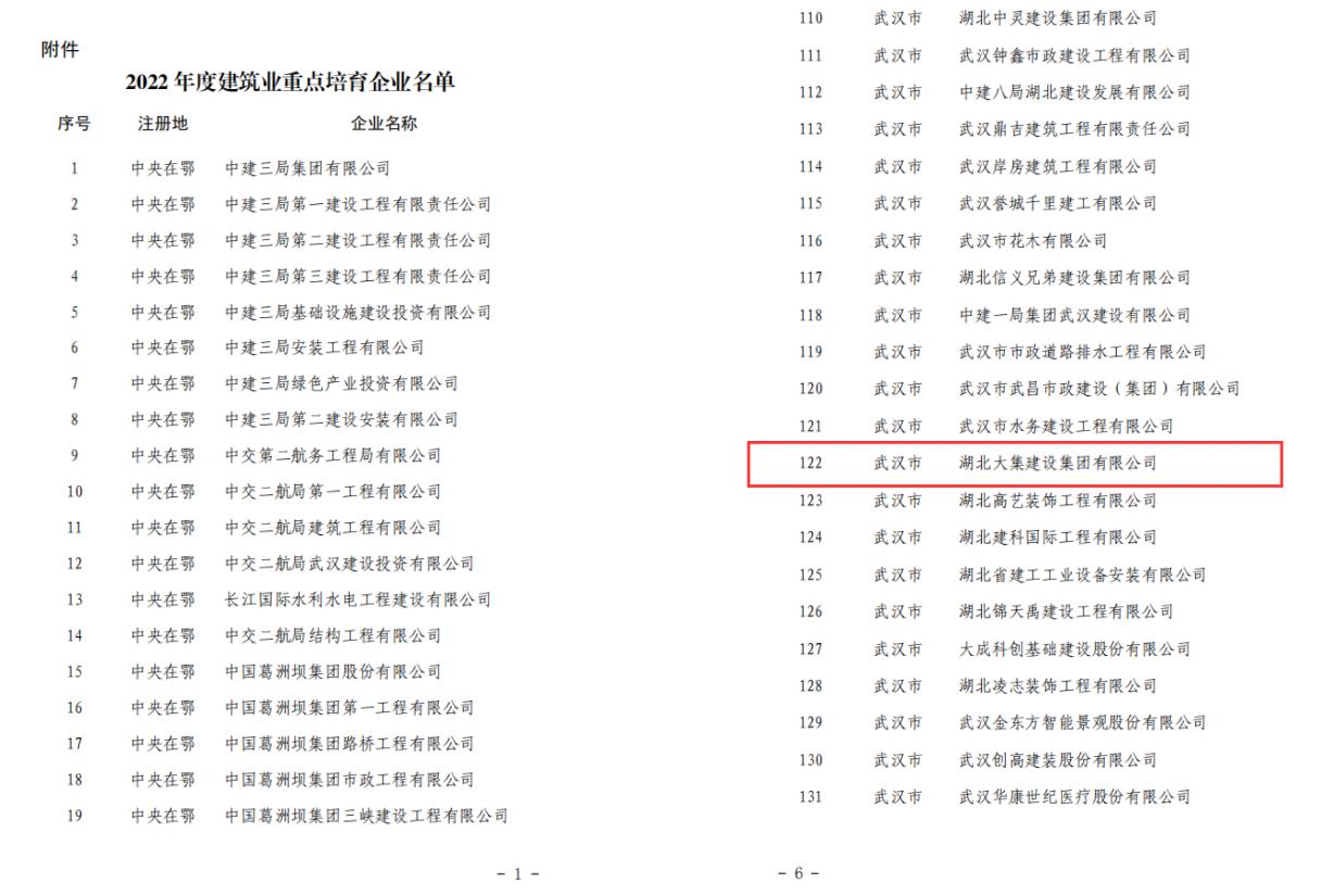 9月20日,湖北省住房和城鄉(xiāng)建設(shè)廳網(wǎng)正式公布湖北省2022年度建筑業(yè)重點培育企業(yè)名單,湖北大集建設(shè)集團成功入選!