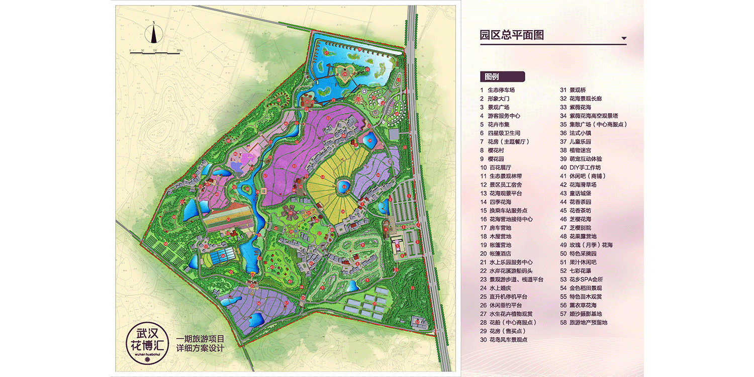 武漢花博匯總投資50億元,總規(guī)劃面積4800畝,邀請國際頂尖設(shè)計團隊擔(dān)綱設(shè)計,以“村-田-林-溪-塘”場地肌理為基礎(chǔ),以創(chuàng)意型花海景觀打造為主題,竭力打造集花卉旅游觀光、文化傳承交流、創(chuàng)意農(nóng)業(yè)體驗、田園養(yǎng)生度假、親水休閑游樂、美麗鄉(xiāng)村體驗、花卉集中展銷等諸多功能于一體的全國性精品休閑度假綜合體,滿足城市人群回歸自然、城郊休憩、體驗野趣、養(yǎng)生度假等極致追求。