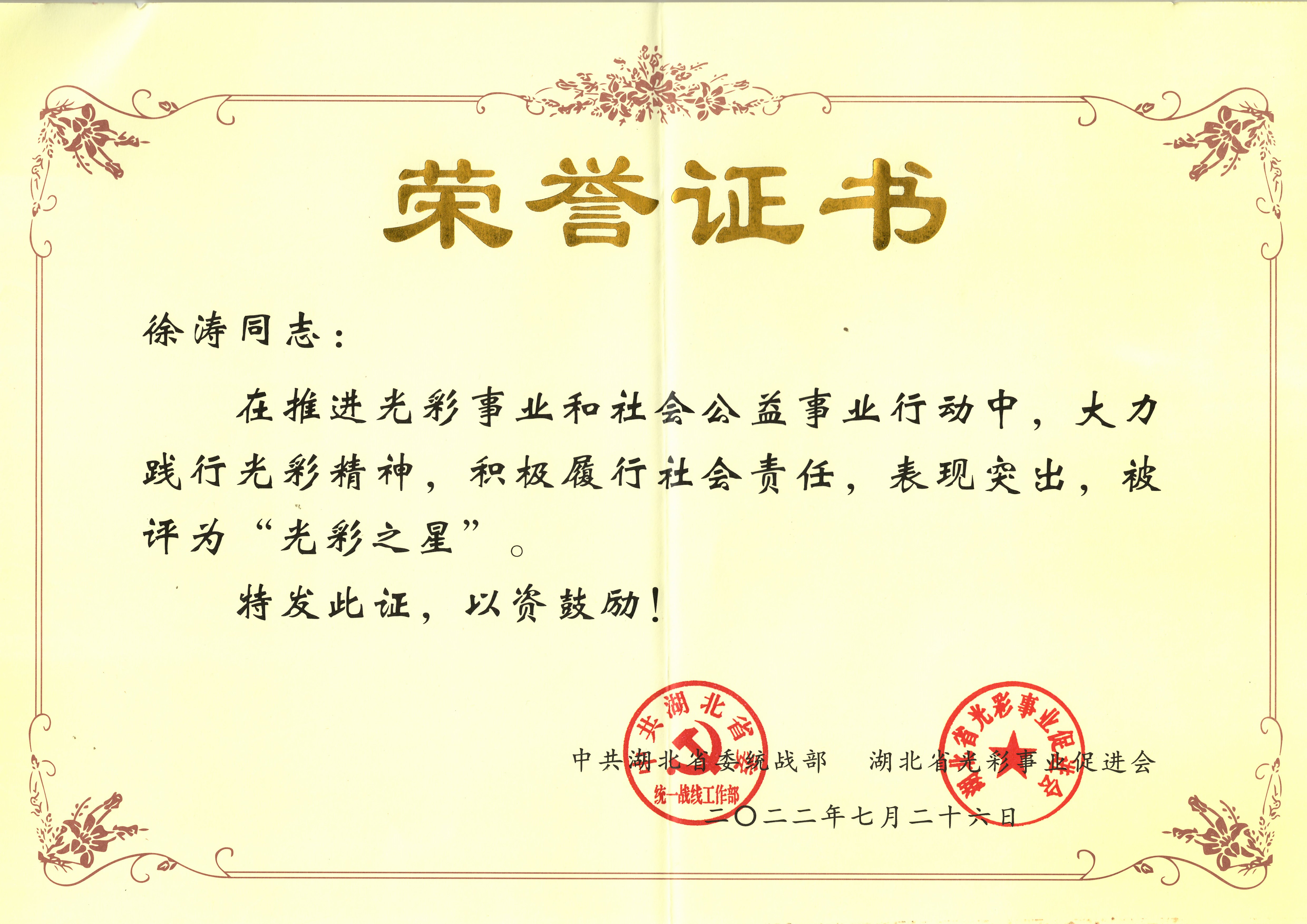 近日,由中共湖北省委統(tǒng)戰(zhàn)部、省光彩事業(yè)促進(jìn)會(huì)共同評(píng)選60名民營經(jīng)濟(jì)人士“光彩之星”表彰會(huì)在恩施召開。會(huì)議表彰了一批熱心公益事業(yè)、積極回報(bào)社會(huì)的優(yōu)秀非公有制經(jīng)濟(jì)人士,湖北大集建設(shè)集團(tuán)有限公司董事長(zhǎng)、武漢閱景匯投資發(fā)展有限公司董事長(zhǎng)徐濤榮獲全省“光彩之星”榮譽(yù)稱號(hào)!